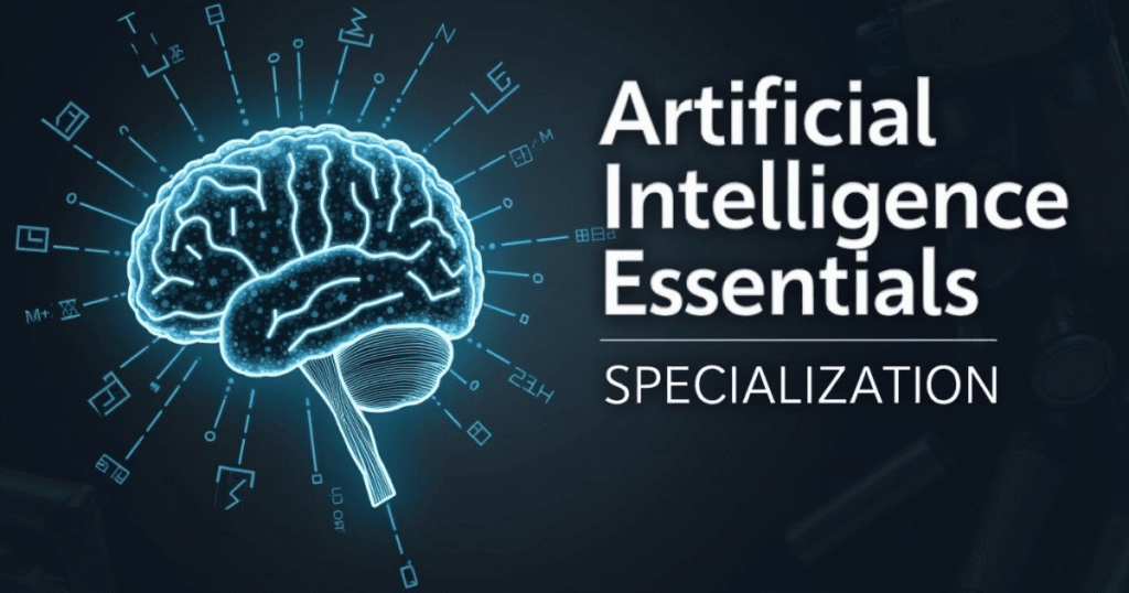Kickstart Your AI Adventure! Perfect for beginners, this concise specialization builds foundational AI skills—machine learning, neural networks, and ethics—through hands-on projects. Boost productivity and confidently navigate the evolving workplace with practical tools to shape the future. Dive in now!